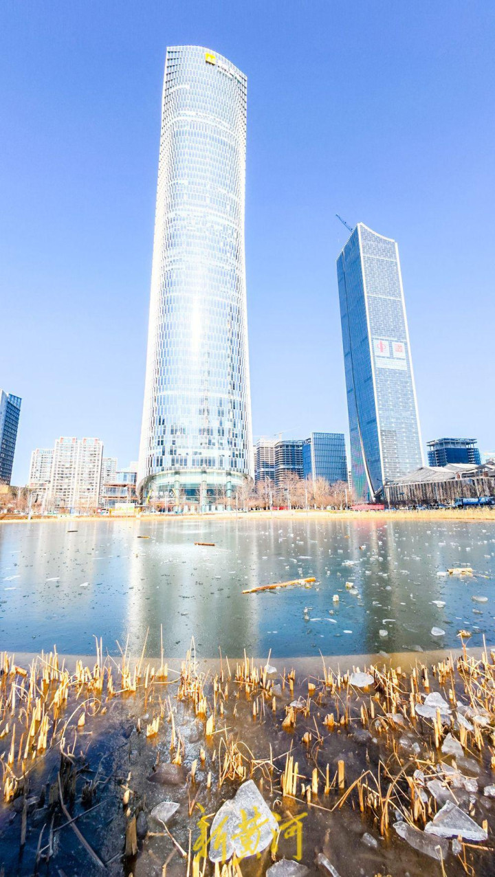 蓝色冰层倒映着澄澈的天空和楼宇轮廓,仿佛在城市中心铺开了一幅静谧而辽阔的冬日画卷,吸引了不少途经市民驻足观赏。